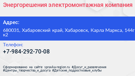 Энергорешения, электромонтажная компания по адресу 680031, Хабаровский край, Хабаровск, Карла Маркса, 144г к2 в дальнейшем Организация, размещена в следующих категориях: