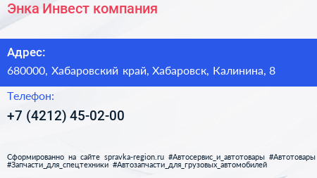Энка Инвест, компания по адресу 680000, Хабаровский край, Хабаровск, Калинина, 8 в дальнейшем Организация, размещена в следующих категориях: