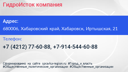 ГидроИсток, компания по адресу 680006, Хабаровский край, Хабаровск, Иртышская, 21 в дальнейшем Организация, размещена в следующих категориях: