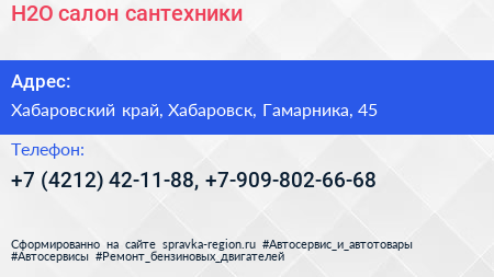 H2O, салон сантехники по адресу Хабаровский край, Хабаровск, Гамарника, 45 в дальнейшем Организация, размещена в следующих категориях: