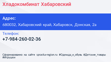 Хладокомбинат Хабаровский по адресу 680032, Хабаровский край, Хабаровск, Донская, 2а в дальнейшем Организация, размещена в следующих категориях: