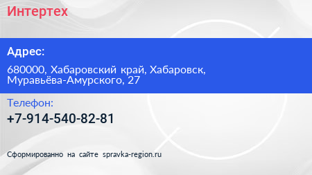 Интертех по адресу 680000, Хабаровский край, Хабаровск, Муравьёва-Амурского, 27 в дальнейшем Организация, размещена в следующих категориях: