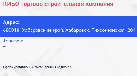 КИБО, торгово-строительная компания по адресу 680018, Хабаровский край, Хабаровск, Тихоокеанская, 204 в дальнейшем Организация, размещена в следующих категориях: