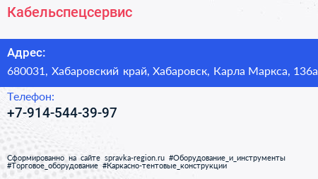 Кабельспецсервис по адресу 680031, Хабаровский край, Хабаровск, Карла Маркса, 136а в дальнейшем Организация, размещена в следующих категориях: