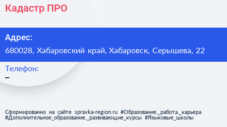 Кадастр-ПРО по адресу 680028, Хабаровский край, Хабаровск, Серышева, 22 в дальнейшем Организация, размещена в следующих категориях: