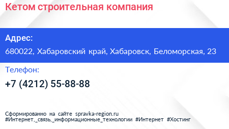 Кетом, строительная компания по адресу 680022, Хабаровский край, Хабаровск, Беломорская, 23 в дальнейшем Организация, размещена в следующих категориях: