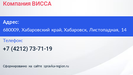 Компания ВИССА по адресу 680009, Хабаровский край, Хабаровск, Листопадная, 14 в дальнейшем Организация, размещена в следующих категориях:
