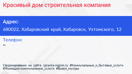 Красивый дом, строительная компания по адресу 680022, Хабаровский край, Хабаровск, Ухтомского, 12 в дальнейшем Организация, размещена в следующих категориях: