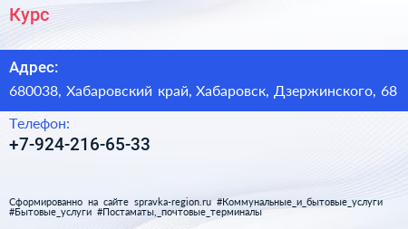 Курс по адресу 680038, Хабаровский край, Хабаровск, Дзержинского, 68 в дальнейшем Организация, размещена в следующих категориях: