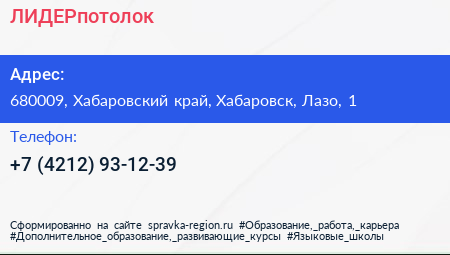 ЛИДЕРпотолок по адресу 680009, Хабаровский край, Хабаровск, Лазо, 1 в дальнейшем Организация, размещена в следующих категориях: