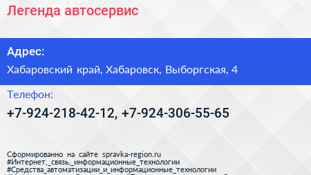 Легенда, автосервис по адресу Хабаровский край, Хабаровск, Выборгская, 4 в дальнейшем Организация, размещена в следующих категориях: