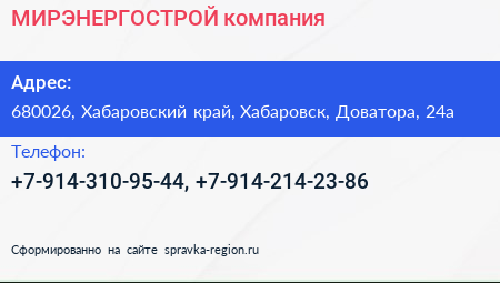 МИРЭНЕРГОСТРОЙ, компания по адресу 680026, Хабаровский край, Хабаровск, Доватора, 24а в дальнейшем Организация, размещена в следующих категориях:
