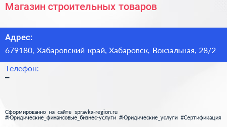 Магазин строительных товаров по адресу 679180, Хабаровский край, Хабаровск, Вокзальная, 28/2 в дальнейшем Организация, размещена в следующих категориях: