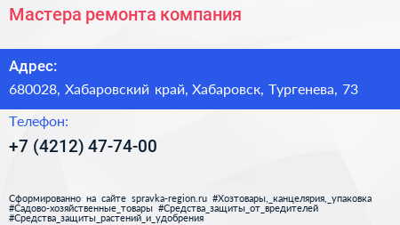 Мастера ремонта, компания по адресу 680028, Хабаровский край, Хабаровск, Тургенева, 73 в дальнейшем Организация, размещена в следующих категориях: