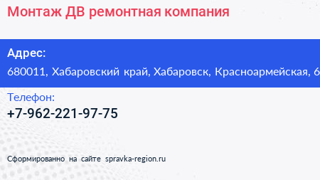 Монтаж-ДВ, ремонтная компания по адресу 680011, Хабаровский край, Хабаровск, Красноармейская, 6 в дальнейшем Организация, размещена в следующих категориях: