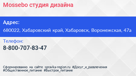 Mossebo, студия дизайна по адресу 680022, Хабаровский край, Хабаровск, Воронежская, 47а в дальнейшем Организация, размещена в следующих категориях: