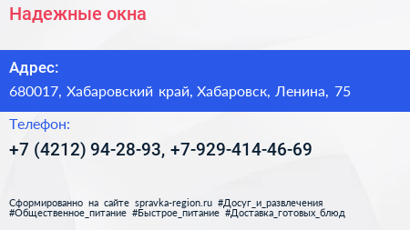 Надежные окна по адресу 680017, Хабаровский край, Хабаровск, Ленина, 75 в дальнейшем Организация, размещена в следующих категориях: