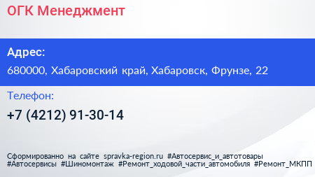 ОГК Менеджмент по адресу 680000, Хабаровский край, Хабаровск, Фрунзе, 22 в дальнейшем Организация, размещена в следующих категориях:
