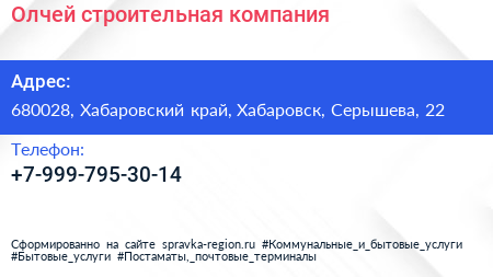 Олчей, строительная компания по адресу 680028, Хабаровский край, Хабаровск, Серышева, 22 в дальнейшем Организация, размещена в следующих категориях: