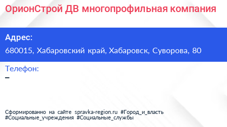 ОрионСтрой-ДВ, многопрофильная компания по адресу 680015, Хабаровский край, Хабаровск, Суворова, 80 в дальнейшем Организация, размещена в следующих категориях: