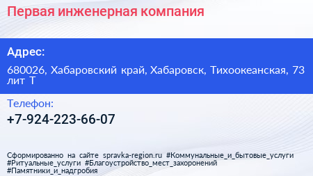 Первая инженерная компания по адресу 680026, Хабаровский край, Хабаровск, Тихоокеанская, 73 лит Т в дальнейшем Организация, размещена в следующих категориях: