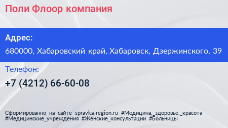 Поли-Флоор, компания по адресу 680000, Хабаровский край, Хабаровск, Дзержинского, 39 в дальнейшем Организация, размещена в следующих категориях:
