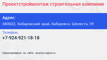 Проектстроймонтаж, строительная компания по адресу 680022, Хабаровский край, Хабаровск, Шелеста, 59 в дальнейшем Организация, размещена в следующих категориях: