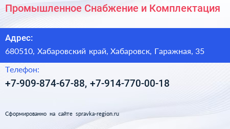 Промышленное Снабжение и Комплектация по адресу 680510, Хабаровский край, Хабаровск, Гаражная, 35 в дальнейшем Организация, размещена в следующих категориях:
