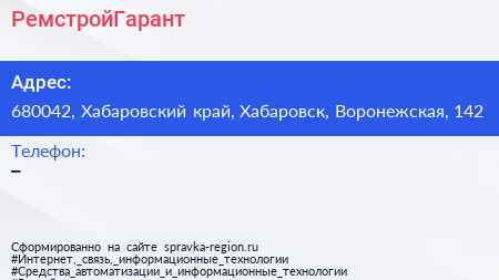 РемстройГарант по адресу 680042, Хабаровский край, Хабаровск, Воронежская, 142 в дальнейшем Организация, размещена в следующих категориях: