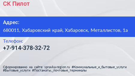 СК Пилот по адресу 680011, Хабаровский край, Хабаровск, Металлистов, 1а в дальнейшем Организация, размещена в следующих категориях: