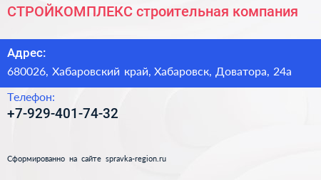 СТРОЙКОМПЛЕКС, строительная компания по адресу 680026, Хабаровский край, Хабаровск, Доватора, 24а в дальнейшем Организация, размещена в следующих категориях: