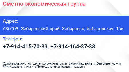 Для связи с организацией воспользуйтесь номером телефона: +7-914-415-70-83, +7-914-164-37-38. Пн: c 09:00-18:00, Вт: c 09:00-18:00, Ср: c 09:00-18:00, Чт: c 09:00-18:00, Пт: c 09:00-18:00, Сб: выходной, Вс: выходной, вы можете обратиться в эту организацию.