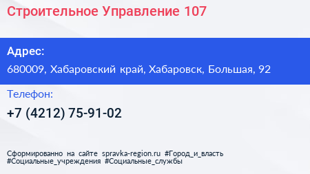 Строительное Управление 107 по адресу 680009, Хабаровский край, Хабаровск, Большая, 92 в дальнейшем Организация, размещена в следующих категориях: