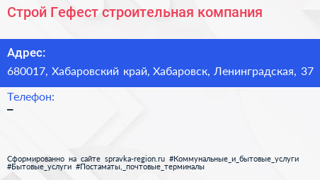 Строй Гефест, строительная компания по адресу 680017, Хабаровский край, Хабаровск, Ленинградская, 37 в дальнейшем Организация, размещена в следующих категориях: