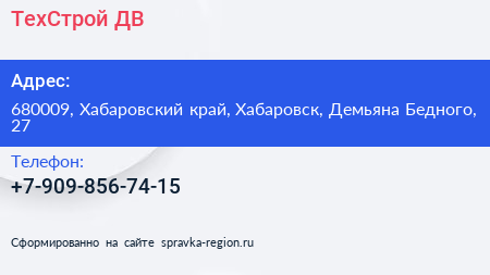 ТехСтрой-ДВ по адресу 680009, Хабаровский край, Хабаровск, Демьяна Бедного, 27 в дальнейшем Организация, размещена в следующих категориях: