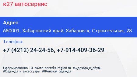 к27, автосервис по адресу 680001, Хабаровский край, Хабаровск, Строительная, 28 в дальнейшем Организация, размещена в следующих категориях:
