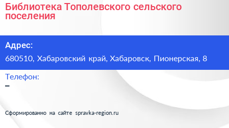 Библиотека Тополевского сельского поселения по адресу 680510, Хабаровский край, Хабаровск, Пионерская, 8 в дальнейшем Организация, размещена в следующих категориях: