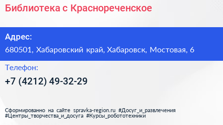 Библиотека, с. Краснореченское по адресу 680501, Хабаровский край, Хабаровск, Мостовая, 6 в дальнейшем Организация, размещена в следующих категориях: