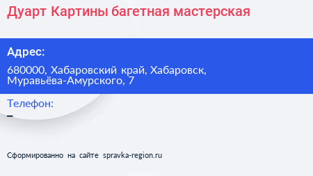 Дуарт Картины, багетная мастерская по адресу 680000, Хабаровский край, Хабаровск, Муравьёва-Амурского, 7 в дальнейшем Организация, размещена в следующих категориях: