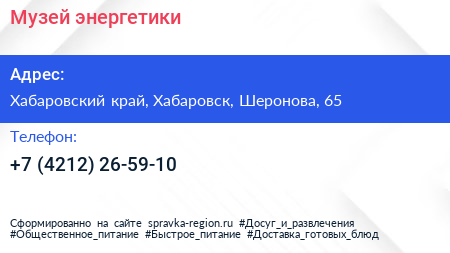 Музей энергетики по адресу Хабаровский край, Хабаровск, Шеронова, 65 в дальнейшем Организация, размещена в следующих категориях: