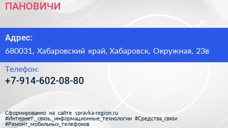 ПАНОВИЧИ по адресу 680031, Хабаровский край, Хабаровск, Окружная, 23в в дальнейшем Организация, размещена в следующих категориях: