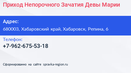 Приход Непорочного Зачатия Девы Марии по адресу 680003, Хабаровский край, Хабаровск, Репина, 6 в дальнейшем Организация, размещена в следующих категориях: