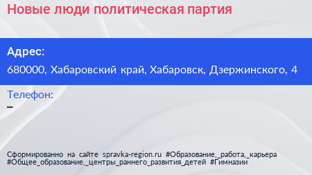 Новые люди, политическая партия по адресу 680000, Хабаровский край, Хабаровск, Дзержинского, 4 в дальнейшем Организация, размещена в следующих категориях: