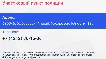 Участковый пункт полиции по адресу 680045, Хабаровский край, Хабаровск, Юности, 13а в дальнейшем Организация, размещена в следующих категориях: