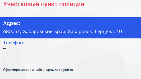 Участковый пункт полиции по адресу 680051, Хабаровский край, Хабаровск, Герцена, 10 в дальнейшем Организация, размещена в следующих категориях: