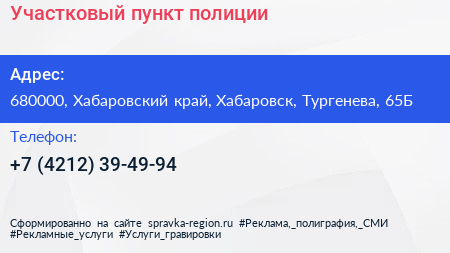 Участковый пункт полиции по адресу 680000, Хабаровский край, Хабаровск, Тургенева, 65Б в дальнейшем Организация, размещена в следующих категориях: