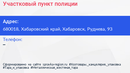 Участковый пункт полиции по адресу 680018, Хабаровский край, Хабаровск, Руднева, 93 в дальнейшем Организация, размещена в следующих категориях:
