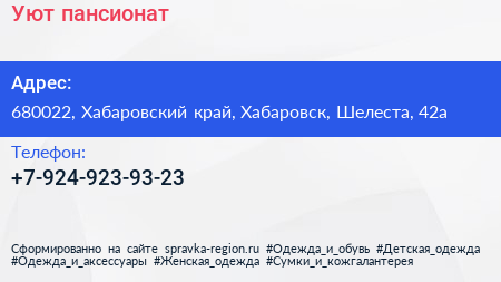 Уют, пансионат по адресу 680022, Хабаровский край, Хабаровск, Шелеста, 42а в дальнейшем Организация, размещена в следующих категориях: