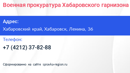 Военная прокуратура Хабаровского гарнизона по адресу Хабаровский край, Хабаровск, Ленина, 36 в дальнейшем Организация, размещена в следующих категориях:
