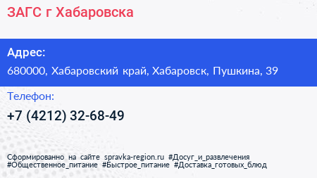 ЗАГС г. Хабаровска по адресу 680000, Хабаровский край, Хабаровск, Пушкина, 39 в дальнейшем Организация, размещена в следующих категориях: